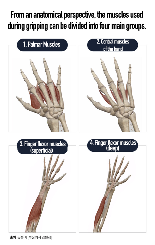 The muscles needed for a strong grip are not located only in the hand; in addition to the palmar and central muscles, they also include the forearm muscles, commonly referred to as the "forearm flexors."