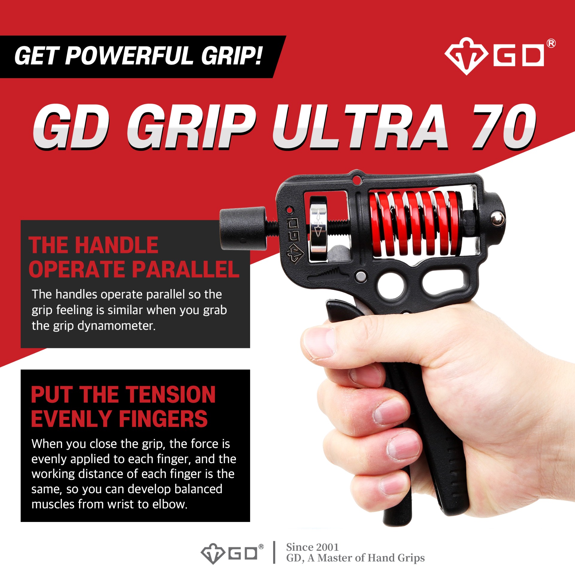 To achieve good grip strength, you should regularly train your hand grip with low resistance while performing negative exercises or adding higher intensity to your workouts to overload the muscle groups. The GD GRIP ULTRA-70 is adjustable from 20 to 70 kg, so you can train your grip strength using only the GD GRIP ULTRA-70; you can train not only warm-ups but also negative training.