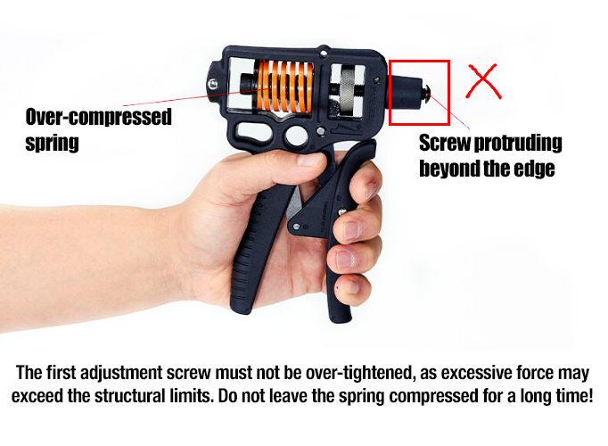 The front adjustment screw should not be overextended, as excessive force may exceed structural limits. Do not leave the spring under load for extended periods!