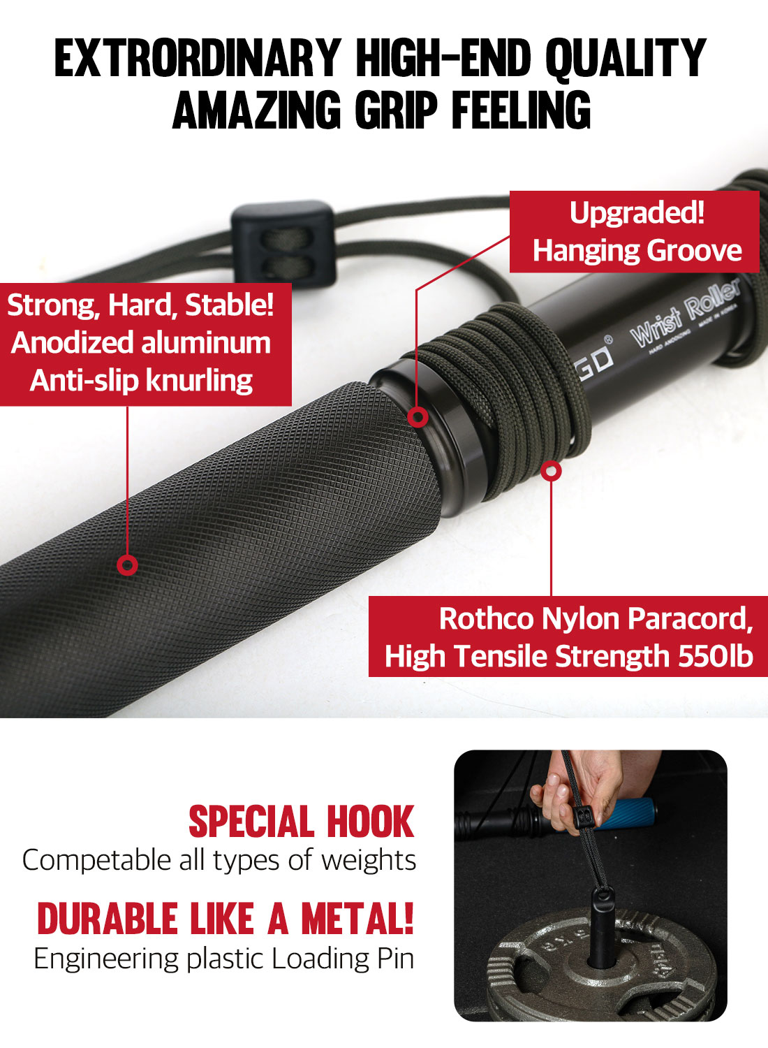 Made from anodized aluminum with anti-slip knurling, high-strength nylon ropes, and a plate holder made of high-strength technical plastic, the GD Hanging Wrist Roller is built to last. The climbing-grade nylon rope ensures long-lasting durability and reliability during forearm workouts.
