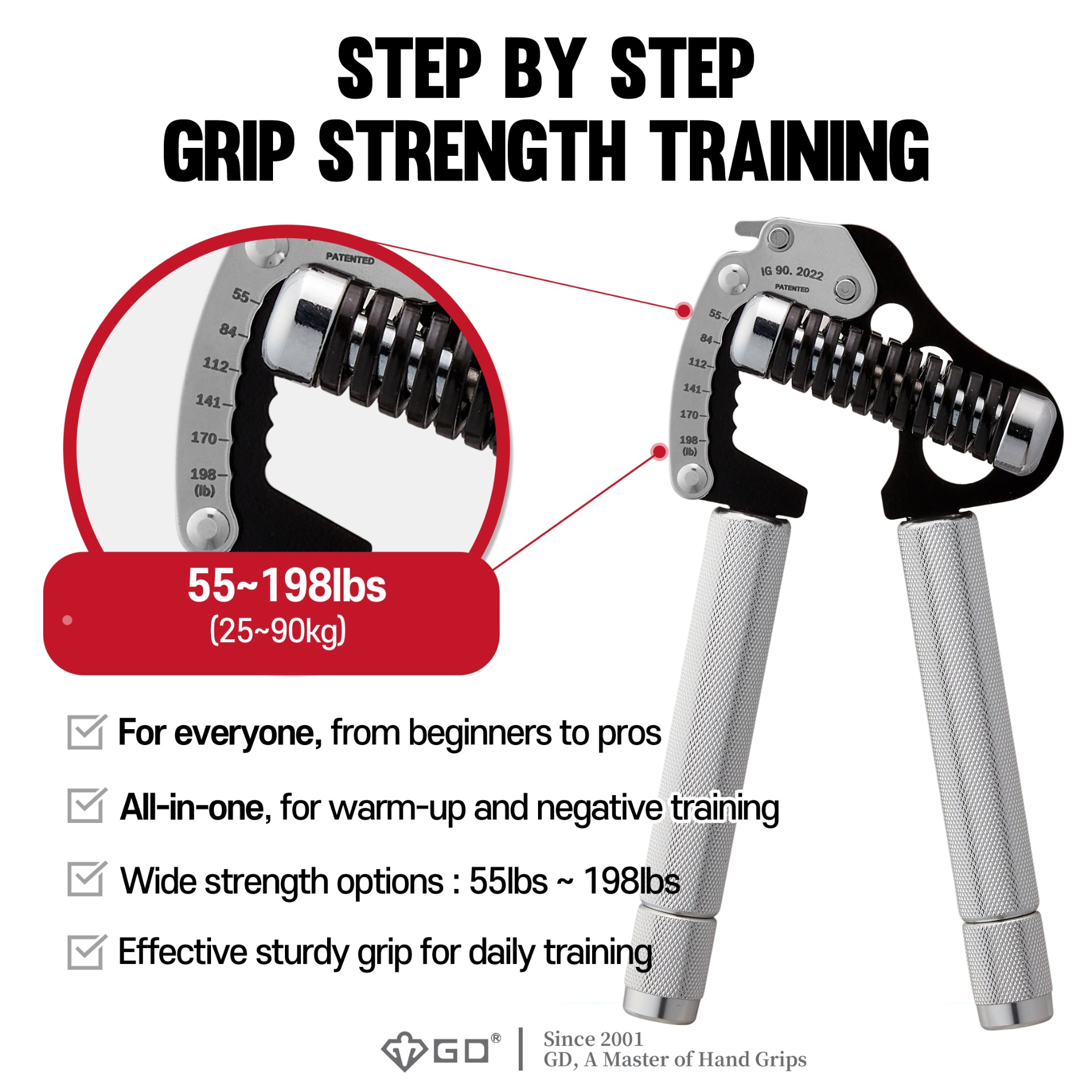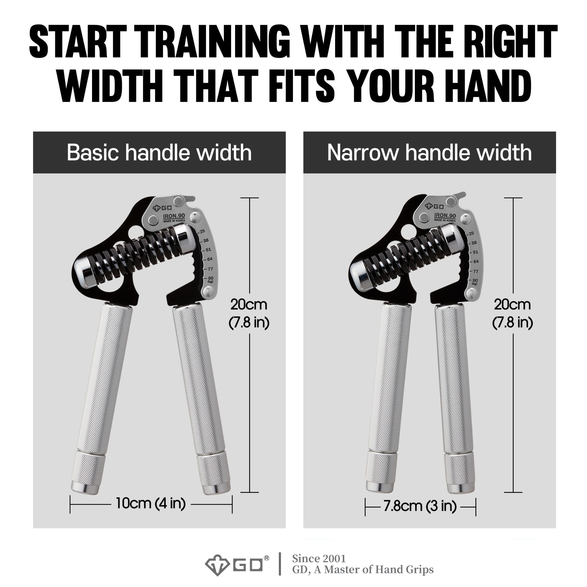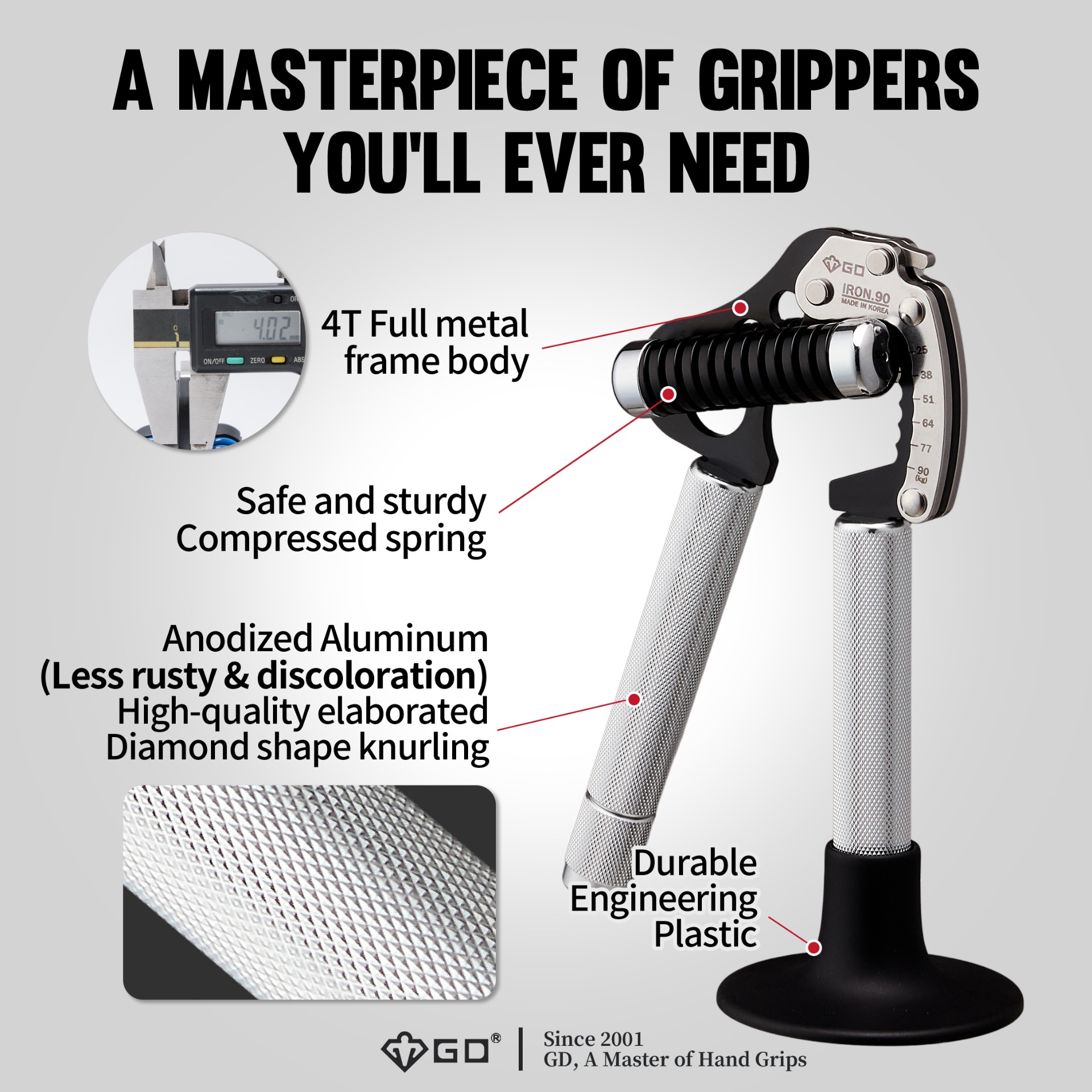 Všechny produkty GD jsou navrženy, vyvinuty a vyrobeny v našem vlastním zařízení v Jižní Koreji. GD Iron Grip je PATENTOVÁN (číslo patentu: NO. US 9,415,262 B2), abychom chránili a poskytovali nejlepší služby, které si naši zákazníci zaslouží.