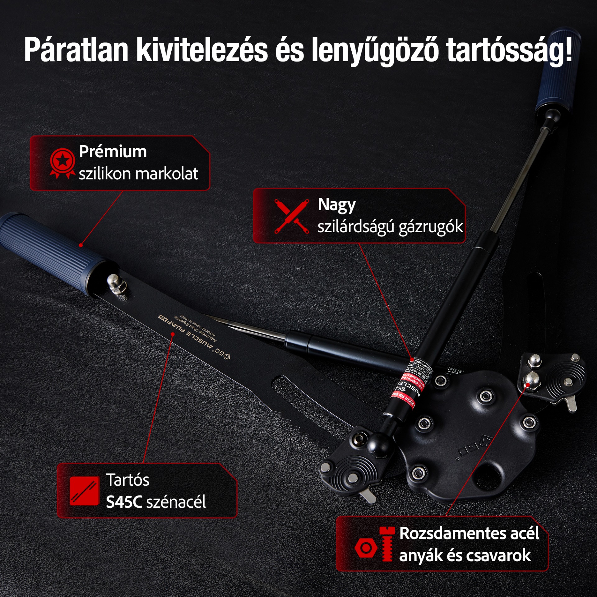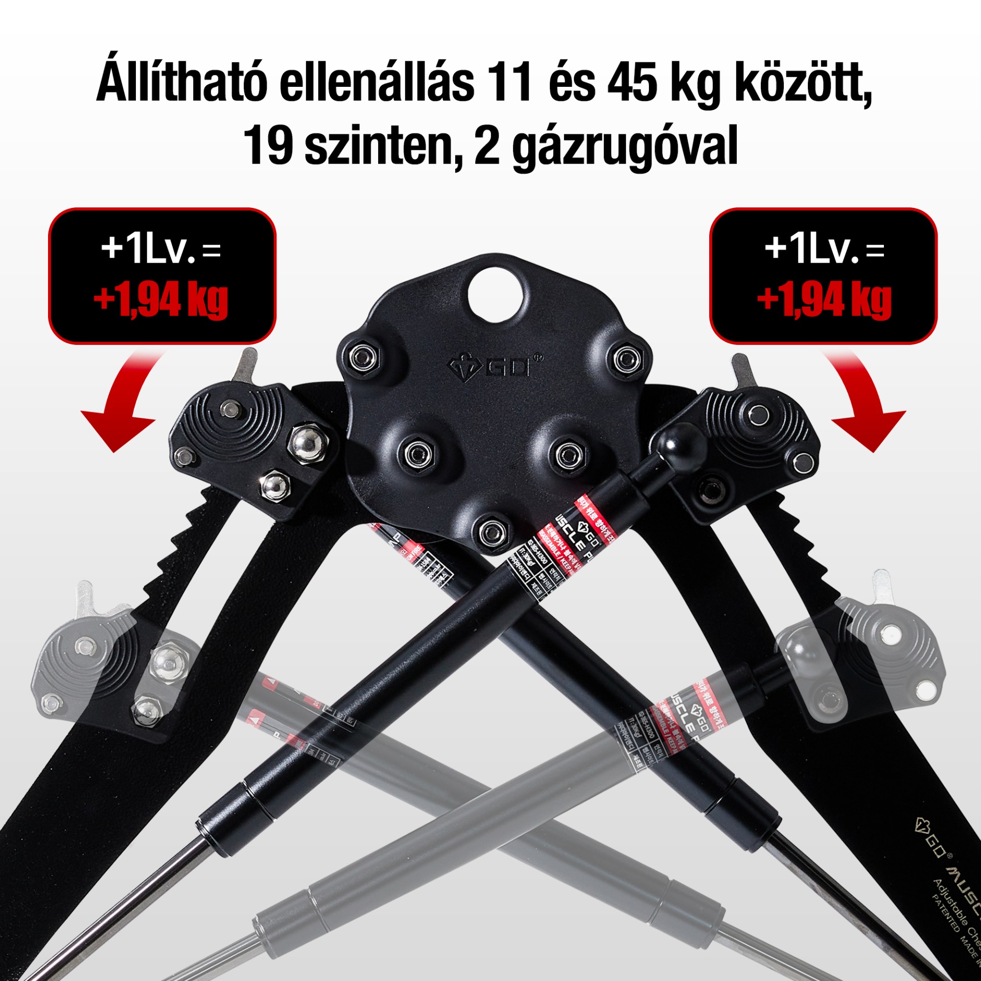 A GD MUSCLE PUMP egyedülálló gázrugós technológiával rendelkezik. A hagyományos csavarrugókkal ellentétben a gázrugó egyenletes és fokozatos ellenállásnövekedést biztosít, ezáltal minimalizálja a hirtelen feszültségoldás kockázatát. Az ellenállás a mozgástartomány teljes szakaszában egyenletes marad, ami biztonságos és hatékony edzést garantál.