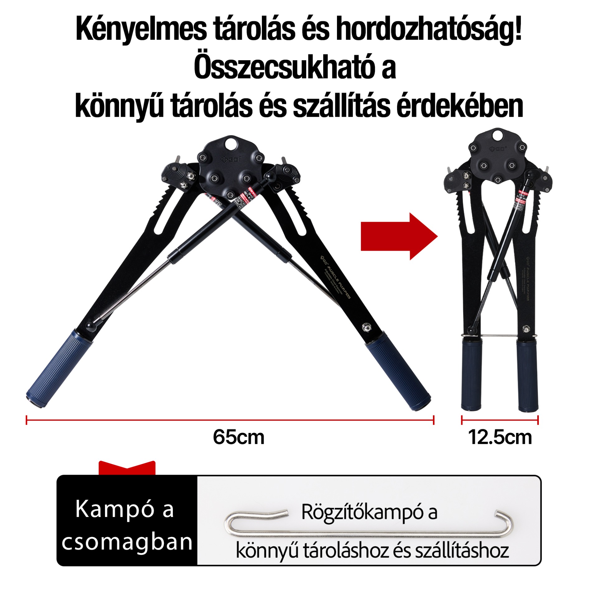 A GD MUSCLE PUMP úgy lett megtervezve, hogy minimális helyet foglaljon, és könnyen összecsukható legyen a tároláshoz. Kis helyekre is elfér, így ideális a kompakt lakóterekhez. A felső nyílás csatlakoztatható egy otthoni edzőállványhoz, így felakasztható és az otthoni edzőterem részévé tehető. Utazás közben az eszköz a mellékelt kulccsal egyszerűen szétszerelhető, ami megkönnyíti a szállítást.