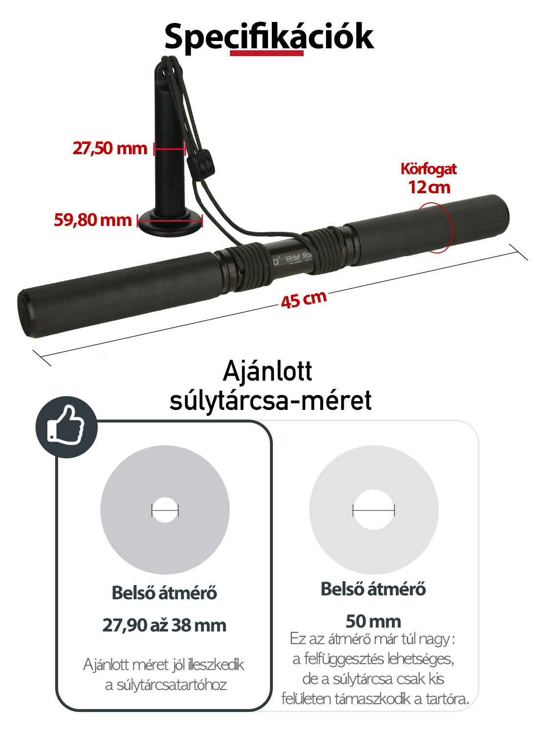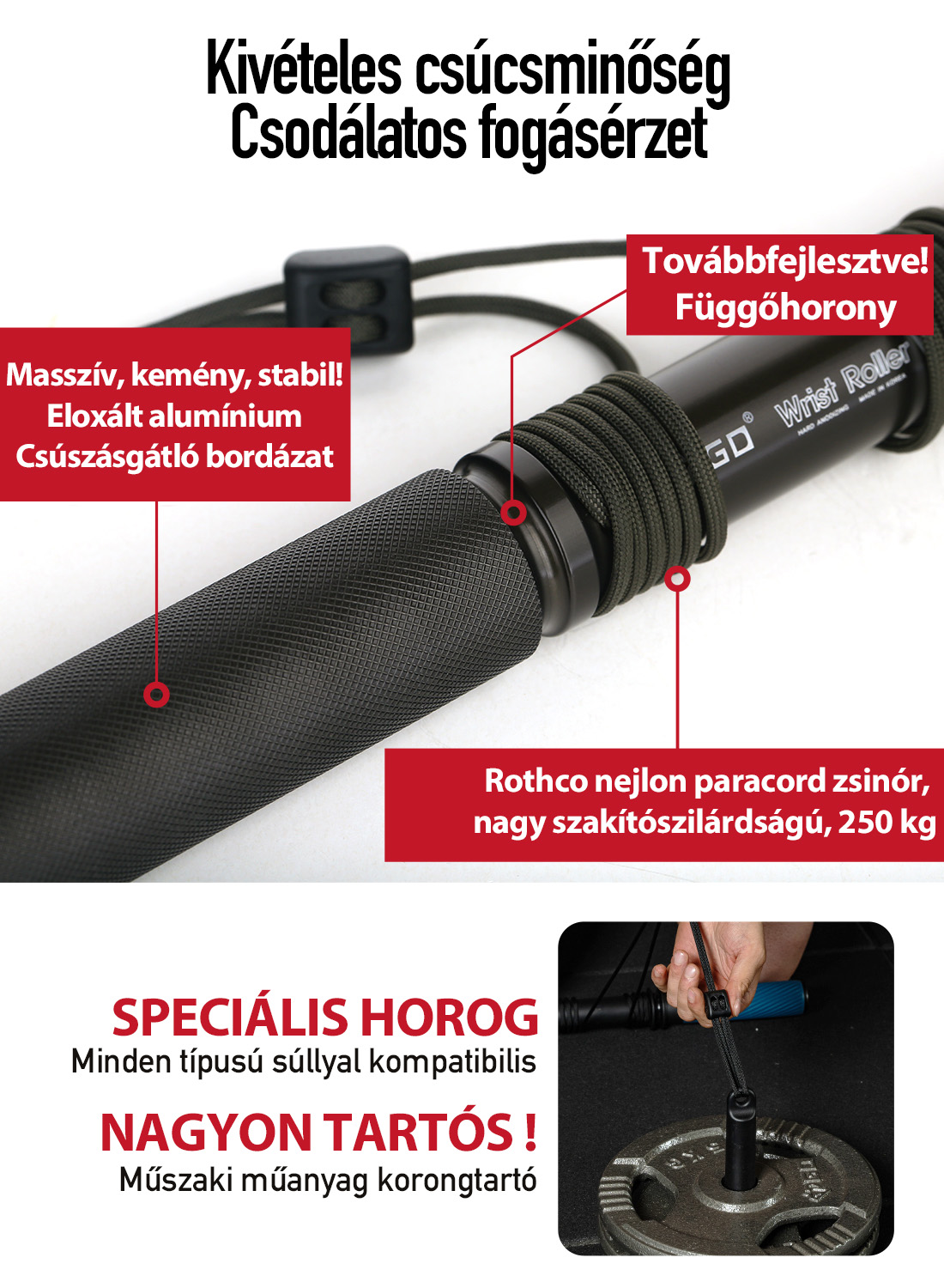 Nagy szilárdságú nejlonkötelek. A hengerre feltekeredő nejlon paracord kötél szakítószilárdsága 250 kg, míg az a kötél, amelyről a hengert fel lehet függeszteni, akár 450 kg-os szakítószilárdsággal rendelkezik, így a Wrist Roller a nehéz edzéseket is bírja. Ez az alkarerősítő minden edzésintenzitás mellett garantálja a biztonságot és a tartósságot. A tárcsatartó műszaki műanyagból készült, és legfeljebb 30 kg-os súlytárcsák elhelyezését javasoljuk rajta. Bár a kötelek rendkívül erősek, a biztonság és a tartósság érdekében 30 kg-ig ajánljuk a használatot. A nagyobb terhelés technikailag lehetséges, de ha a tárcsák a tartóval együtt leesnek, megsérülhet a tárcsatartó vagy a padló.
